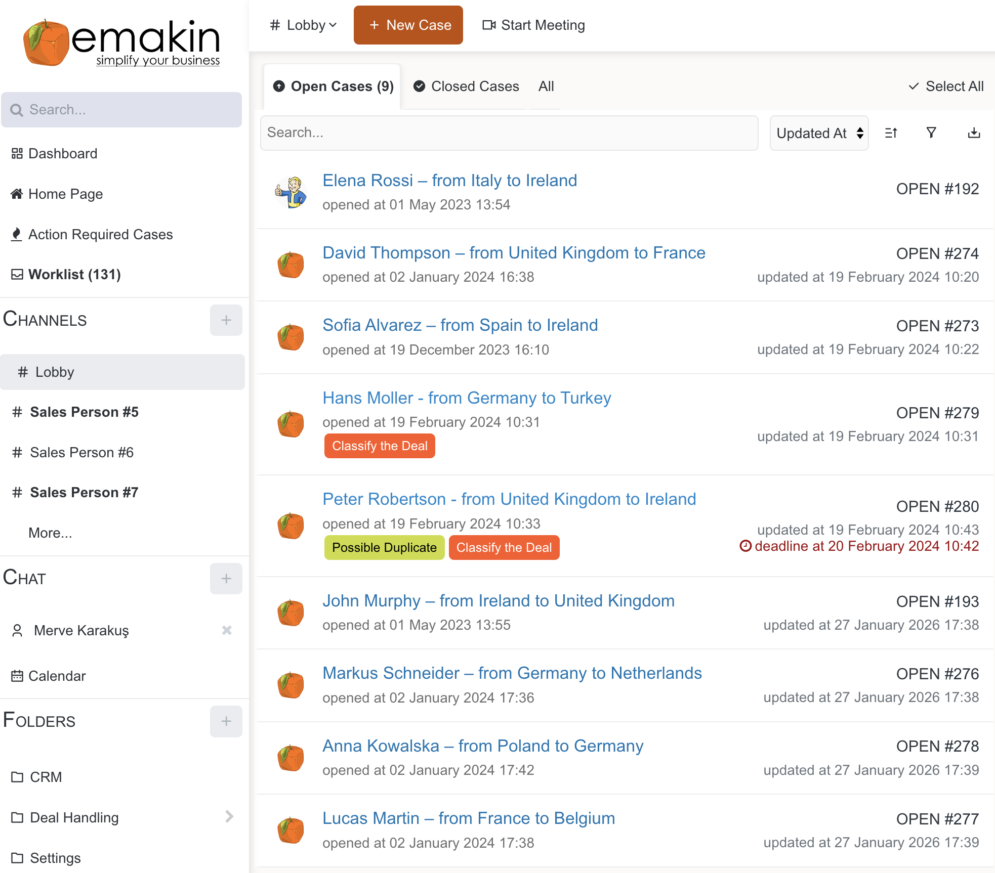 Each case shows customer details, status badges, assigned person, and timestamps.