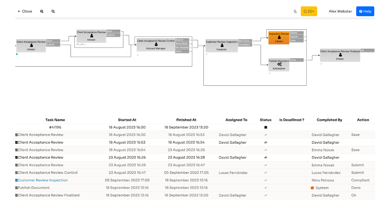 Once submitted, documents are instantly validated and routed to compliance reviewers. If anything is missing or inconsistent, the system notifies the responsible party — no delays, no email chains, no inbox clutter.